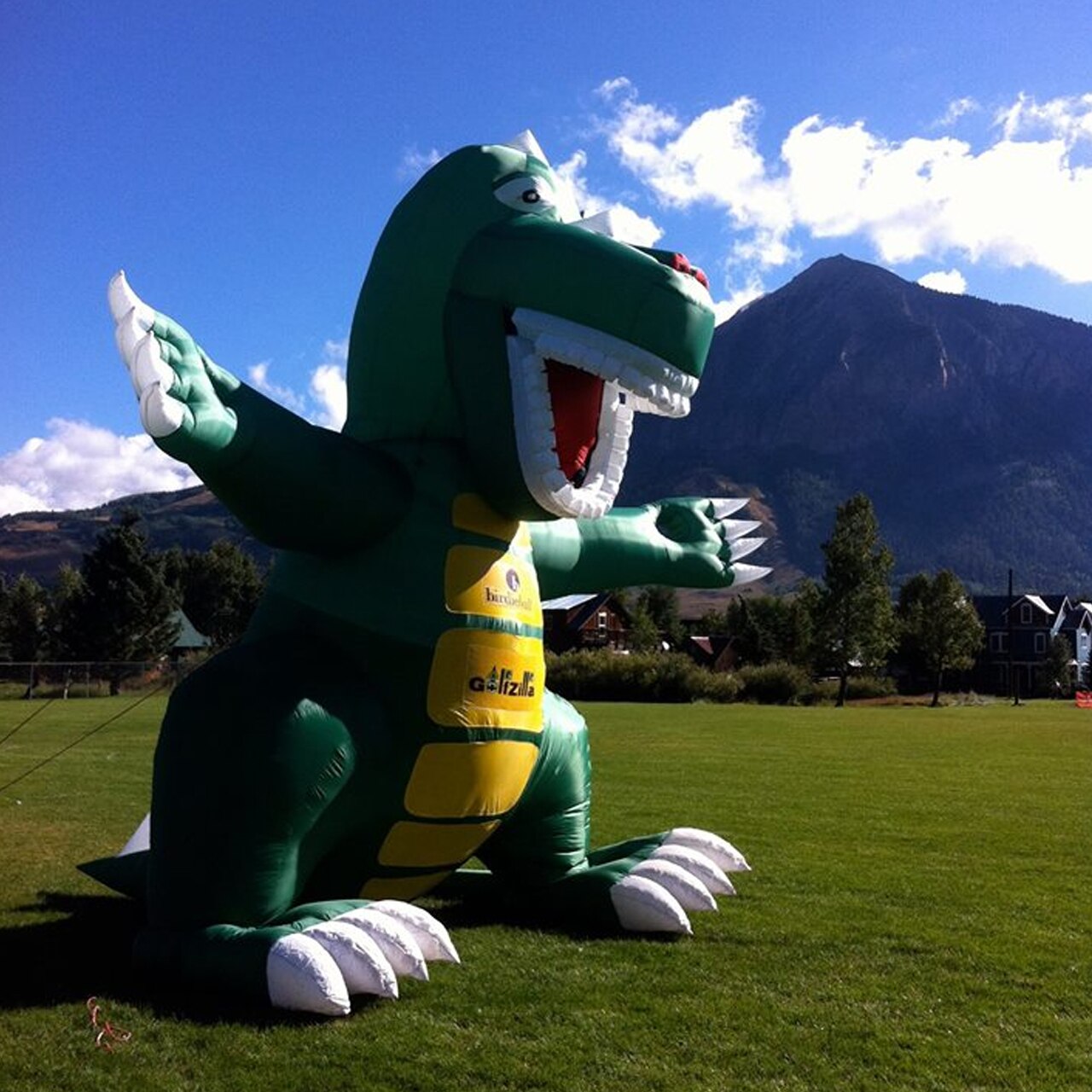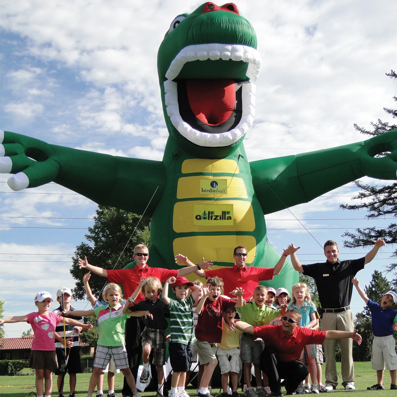 Most people will agree that the BirdieBall is the most amazing limited distance, long hang time, unique looking golf ball in golf.  What makes BirdieBall extraordinary is the myriad of targeting options that create truly amazing events.  BirdieRex is the king of the BirdieBall inflatable targeting systems.   Standing nearly 20' tall BirdieRex is the largest of the inflatable critter family.  BirdieBalls go up in the air faster than a golf ball and stay in the air longer.  Utilizing the unique flight attributes of the BirdieBall, BirdieRex can be as close as 20 feet from your participants.  Even the youngest of golfers can get the BirdieBall into BirdieRex's mouth.  In this web page video listings is a video showing a four year old hitting a BirdieBall into BirdieRex's mouth.